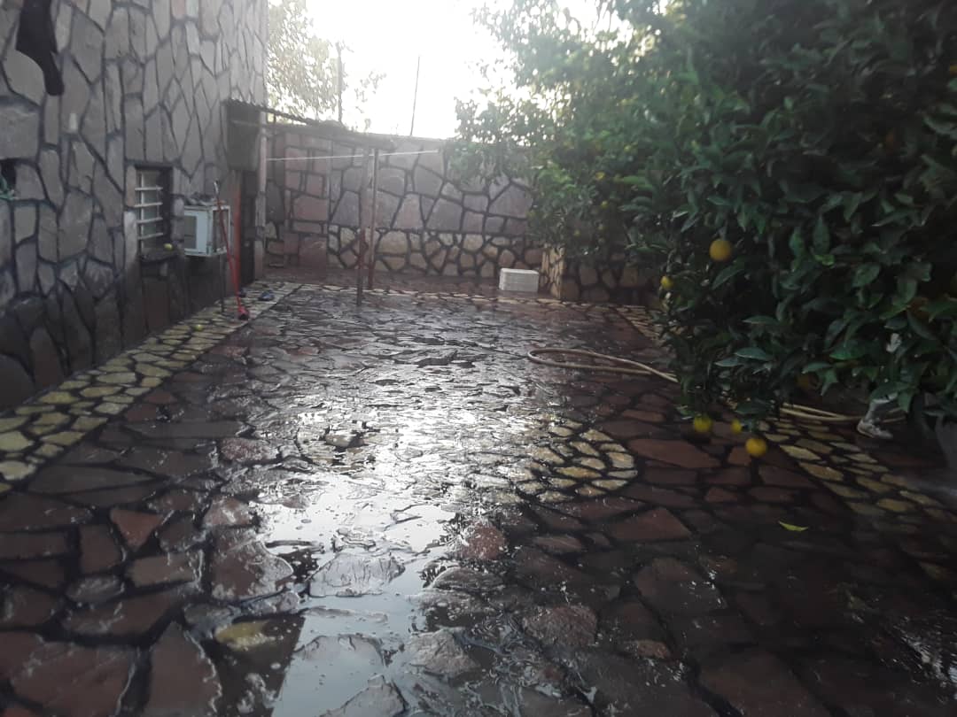 محوطهسازی بینظیر: کف کل محوطه و دیوارهای باغ با سنگ کوهی ورقهای کار شده که جلوهای لوکس و طبیعی به ویلا بخشیده است.
